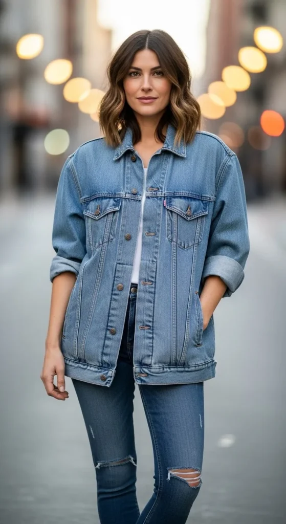 - Oversized denim jacket + fitted jeans
