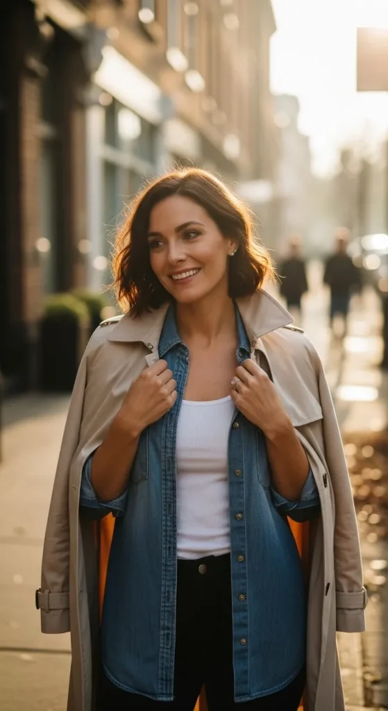 - Neutral trench coat over a denim set