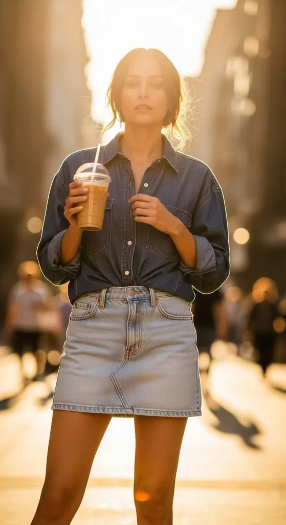 - Denim mini skirt + oversized denim shirt