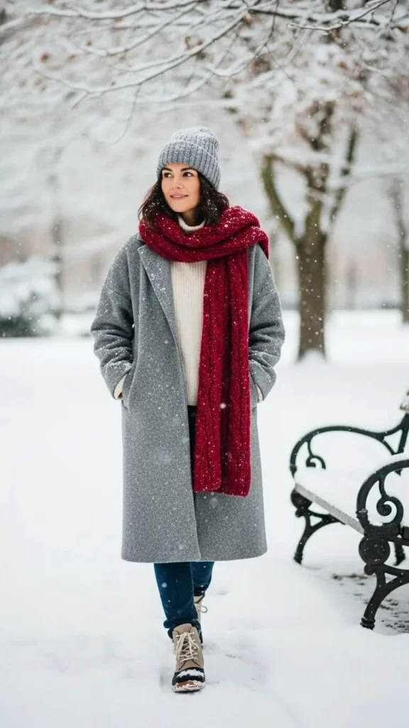 - Sweater + straight jeans + scarf + long coat