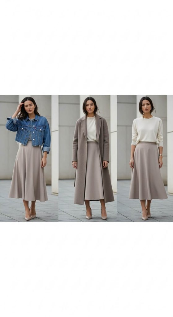 Midi skirts hit in the middle zone of your legs, so you need the right layering pieces to keep proportions clean.