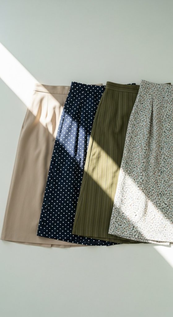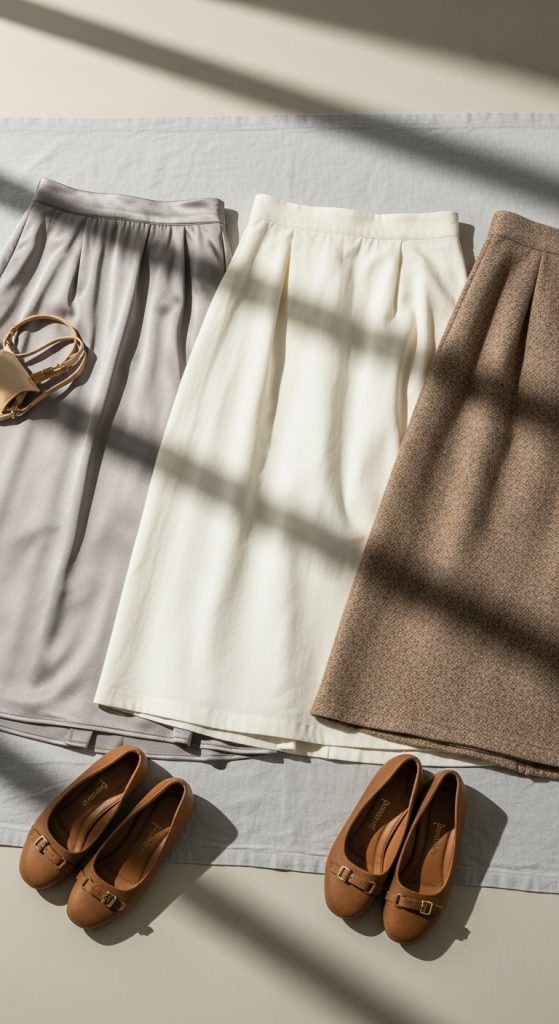 Midi skirts are flexible because fabric choices completely change the vibe.