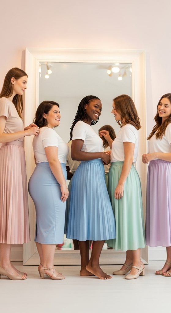 Midi skirts work for every body type—they just need the right length, silhouette, balance, and styling tricks. Start with pieces you already own, test different lengths in front of a mirror, and try these simple formulas until you find your favourites.