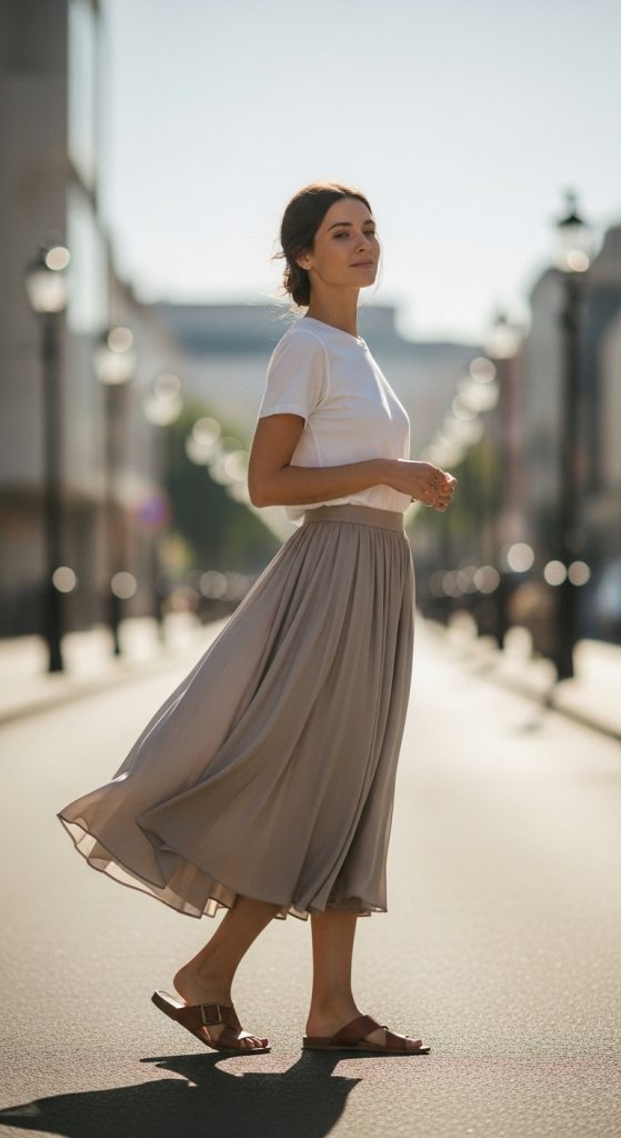 Try white sneakers or cushioned sandals. They work well with A-line or flowy skirts.