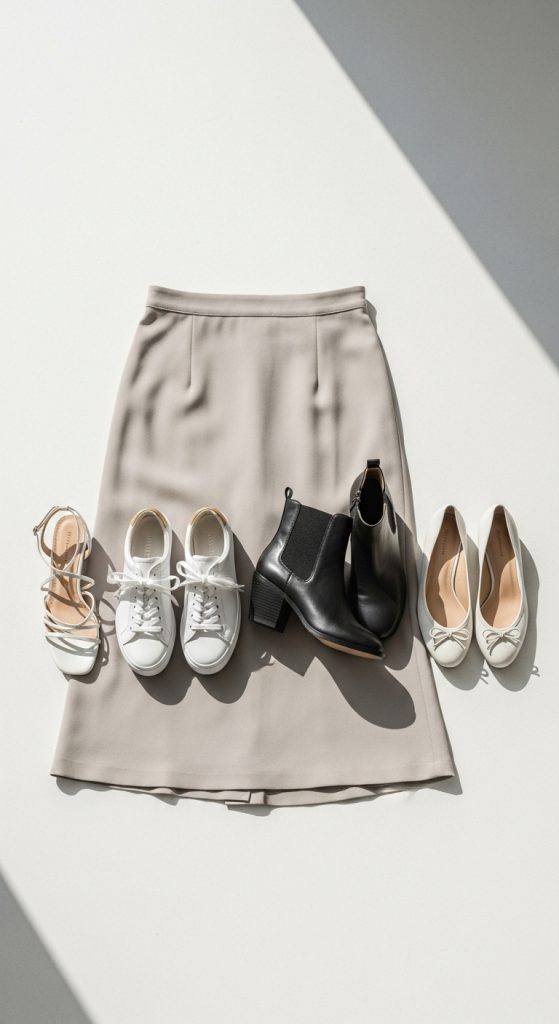 Shoes completely change how your midi skirt reads—dressy, casual, minimal, or bold.