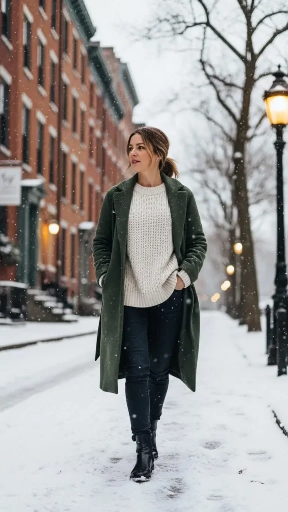 Skinny jeans balance perfectly with cozy winter layers, as long as they’re intentional.
