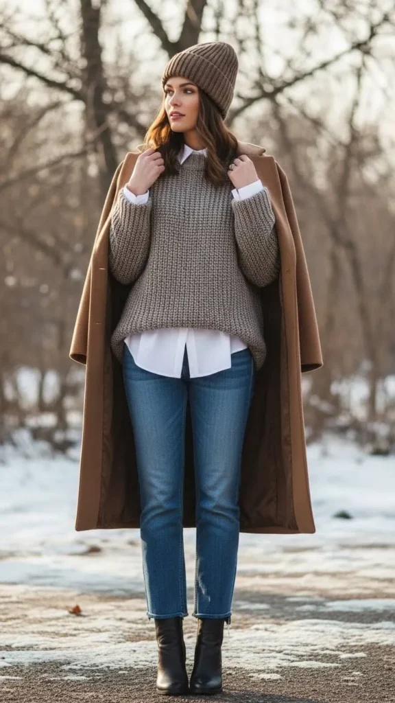 Structured outerwear, like wool coats or fitted puffers, helps offset the softness of an oversized knit.