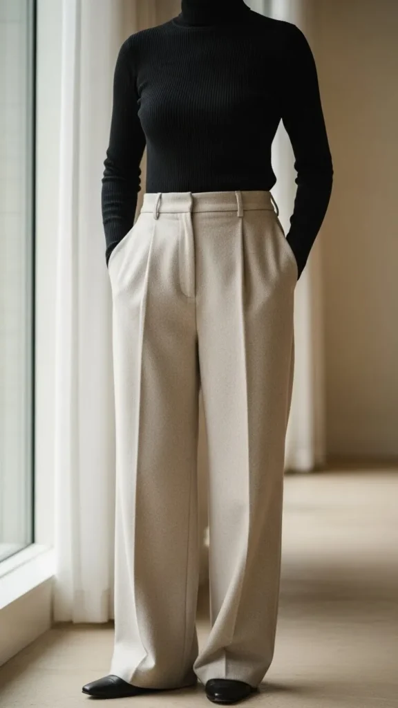 Wide-leg wool trousers are comfy and roomy, perfect for layering. Pair with a fitted black turtleneck tucked in for clean lines. This pairing balances structure and softness. Look for wool pants on clearance or secondhand to keep costs down. Minimal jewelry completes the look elegantly.