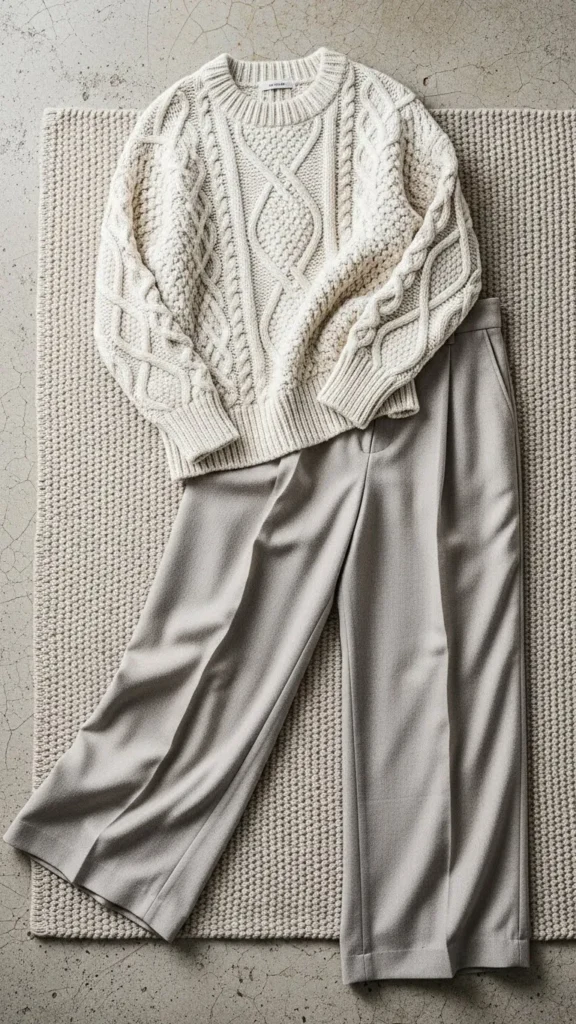 22. Cable Knit Sweater with Wool Trousers
