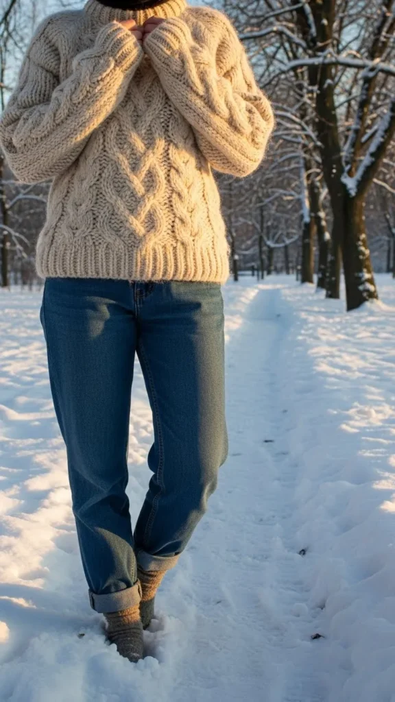 A chunky knit sweater paired with straight-leg jeans is a winter staple. Choose soft, neutral tones for a minimalist vibe. You don’t need an expensive sweater; affordable cotton blends work well. Roll the jeans’ cuffs slightly and combine them with ankle boots for an easy weekend look. This outfit requires minimal tailoring but gives maximum comfort with a minimal edge.