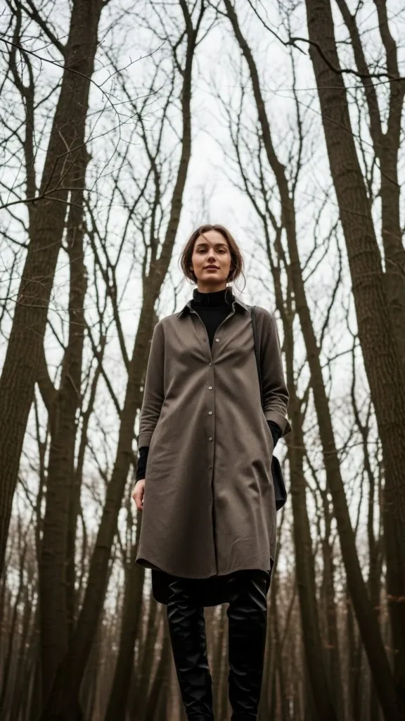 Use a button-down shirt dress over a fitted turtleneck to extend wearable months. Add knee-high boots to anchor the look. Look for sales on shirt dresses or use a long oversized shirt to mimic the style at low cost. This layering tactic adds warmth without bulk.