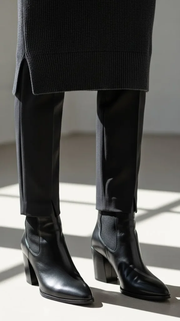 Kick off your outfit with a sharp pair of leather boots. Combine with slim trousers and a fitted knit top for a look that controls volume and keeps things neat. Leather boots can last years, making them worth investing in during sales or secondhand. Swap out heels for flats for everyday minimalism.