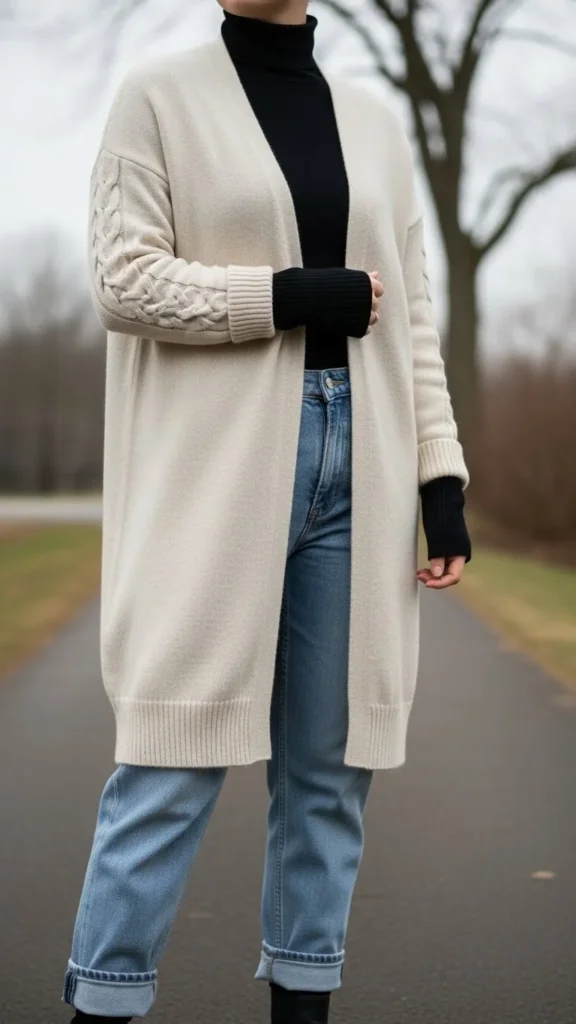 5. Long Cardigan Layered over Turtleneck and Jeans