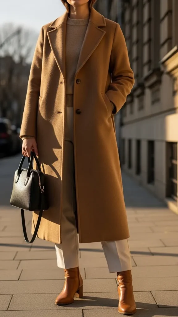 A medium-length coat is versatile for office or casual wear. Pair with black trousers and a matching turtleneck for a clean look. This outfit uses basic pieces you likely already have or can find cheaply. Keep accessories minimal to match.