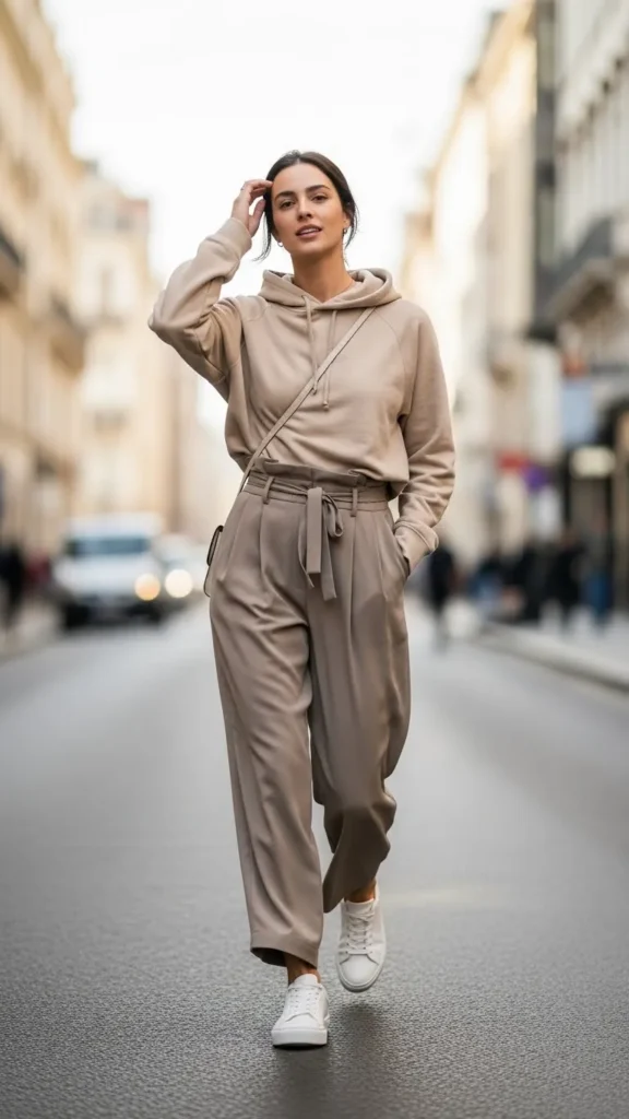 12. Neutral Hoodie with Wide Trousers and Sneakers