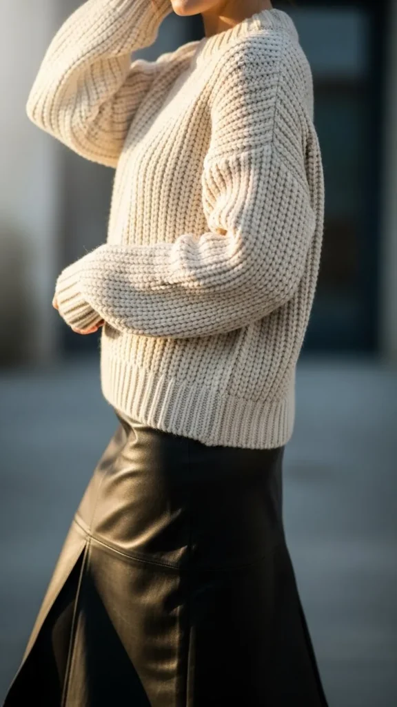 Mix textures by pairing a chunky knit with a simple leather skirt. The leather adds sleekness, the knit brings coziness. Midi skirts are easy to find at reasonable prices and knitwear can be layered underneath sweaters you already own. Add tights for cold days.