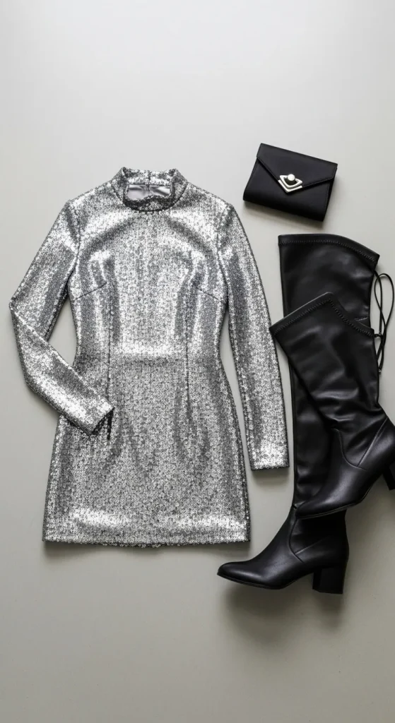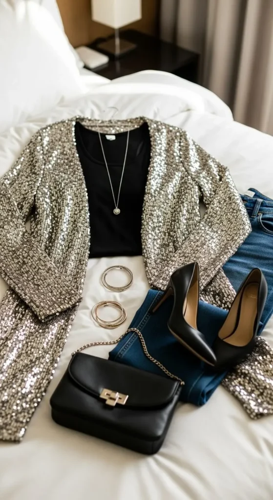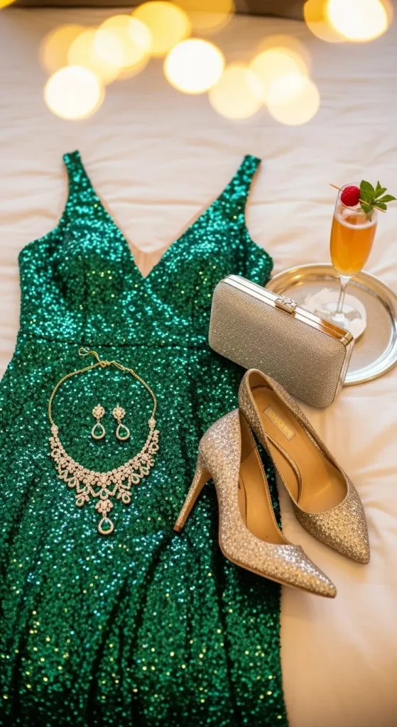 A sequin mini dress is timeless for New Year’s Eve. You can choose silver, gold, or rose tones depending on your mood. Keep accessories simple—hoop earrings and nude heels let the dress shine. If you’re on a budget, add a thrifted clutch or make your own glitter belt using old rhinestones. A light faux fur jacket completes the look for outdoor parties.