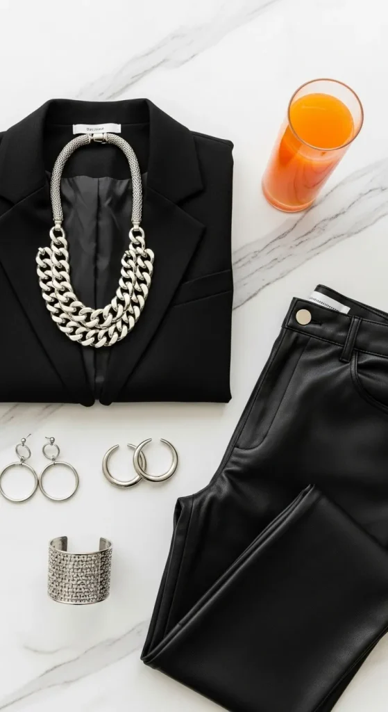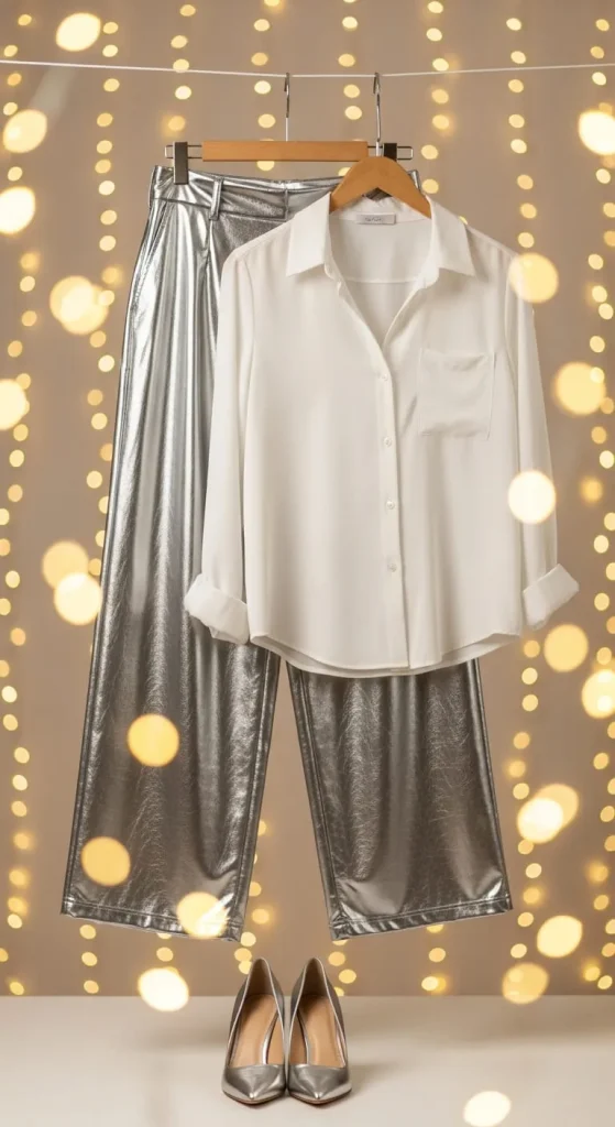 Silver pants bring instant New Year’s energy. Match with a simple white shirt for balance. Roll up the sleeves and tuck in loosely. Add bold earrings or glitter shoes to make it party-ready.