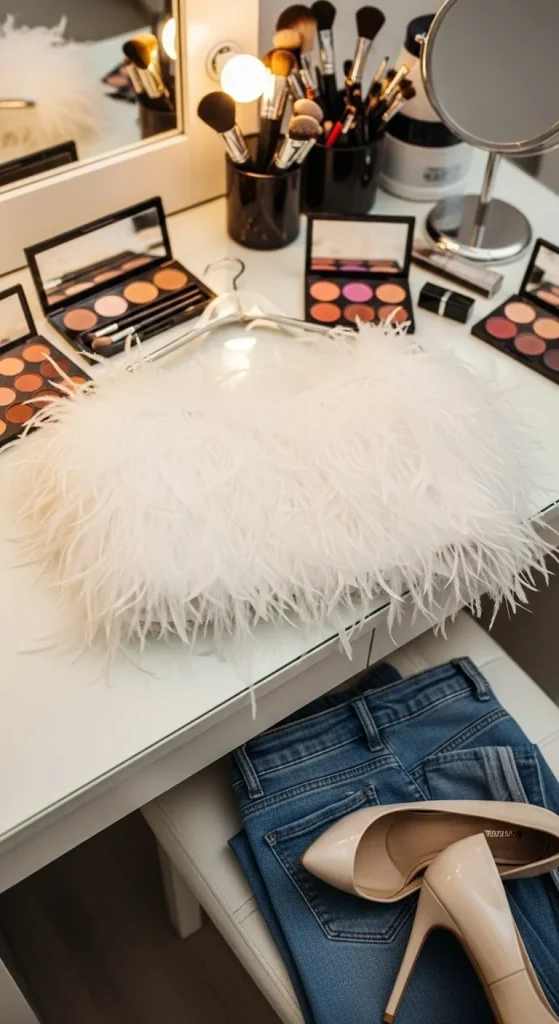 Mix casual and glam with a feathered top and jeans. It’s playful and comfortable for home parties. You can make your own by sewing feather trim on a plain tank top. Pair with hoops and glossy heels.