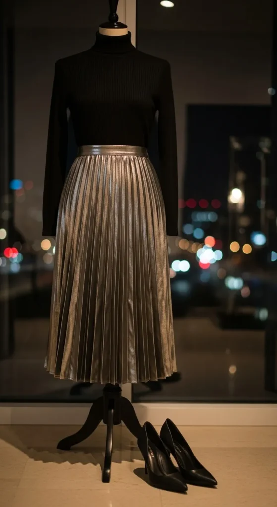 A metallic pleated skirt pairs beautifully with basics like turtlenecks or crop tops. It shines under lights and lets you move freely. Style with ankle boots or strappy heels. If you’re saving money, DIY your skirt shine by sewing small sequins or metallic patches on an old midi skirt.