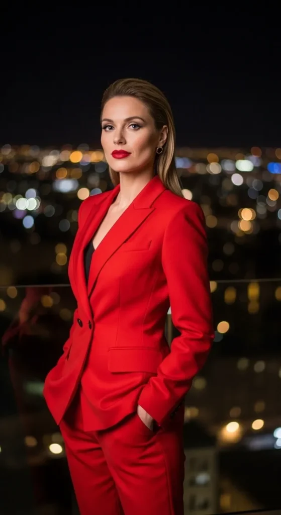 Red stands for confidence. A matching blazer and pants combo works for dinners or rooftop events. Keep the inner top neutral and add gold jewelry. Try affordable sets from thrift shops—tailor them for a perfect fit.