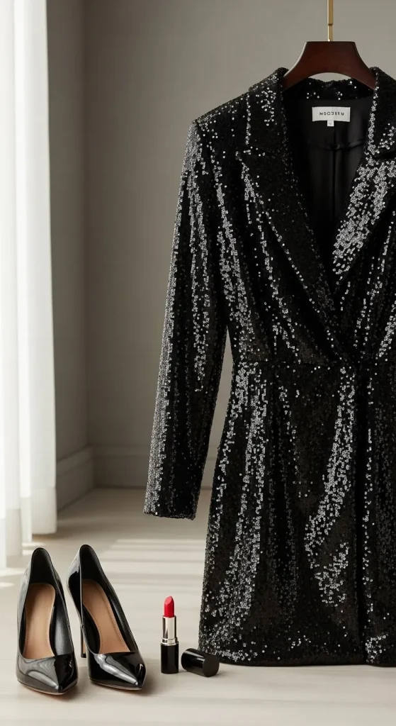 A blazer dress feels powerful and chic. Sequins add shine while the structured cut keeps it classy. Pair with minimal heels and sleek hair. You can thrift a men’s blazer and tailor it short for a DIY version.