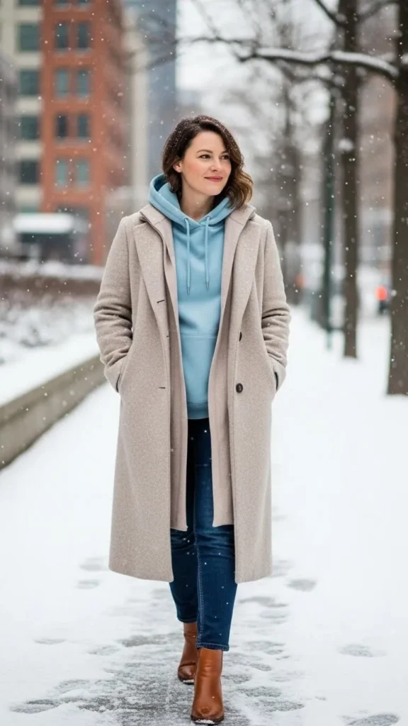 19. Baby Blue Hoodie Layered Under Long Coat