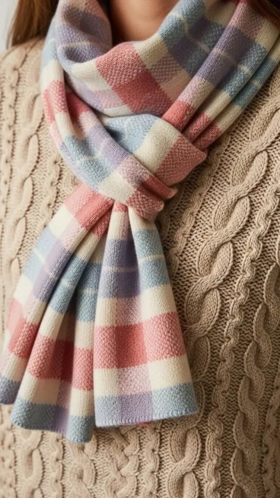 A champagne beige pastel sweater pairs well with a checked scarf in varying pastel tones. Mix and match patterns gently for a thoughtful but simple style. Scarves are easy to find affordably and can refresh an outfit instantly.