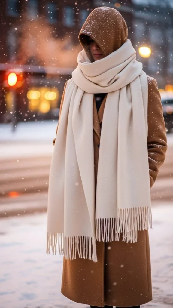 A giant cream pastel blanket scarf over a camel coat offers a soft but striking winter look. Look for large scarves at discount retailers or in thrift stores. This DIY idea can be made by sewing two smaller scarves together for a budget-friendly upgrade.