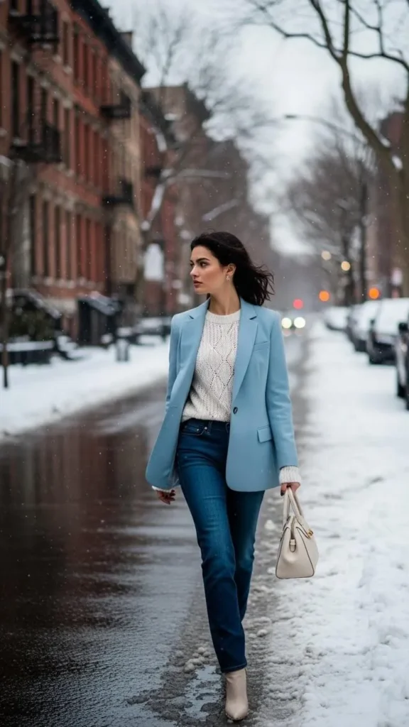 For dressier occasions, an icy blue blazer over a thin knit sweater blends soft color with winter layering. Blazers can be found at thrift stores and paired with jeans or trousers. This look balances warmth with style.