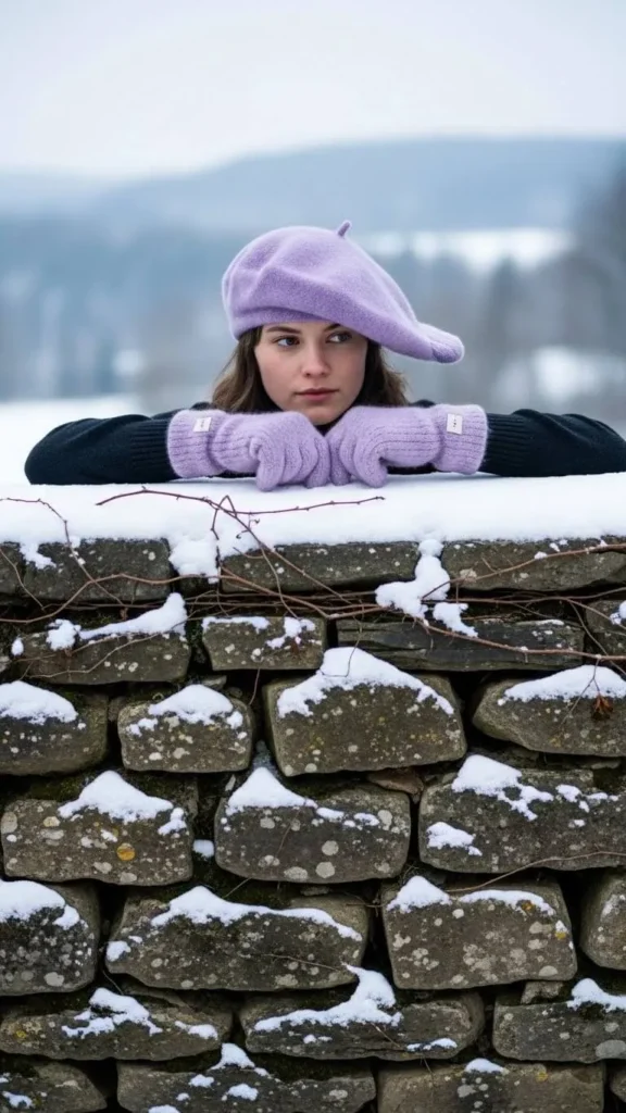 A light lilac beret with matching gloves brings elegance to any winter look. You can find inexpensive sets or DIY gloves by adding fabric paint or sewn embellishments. These small pastel touches add a romantic vibe to simple cold-weather outfits.