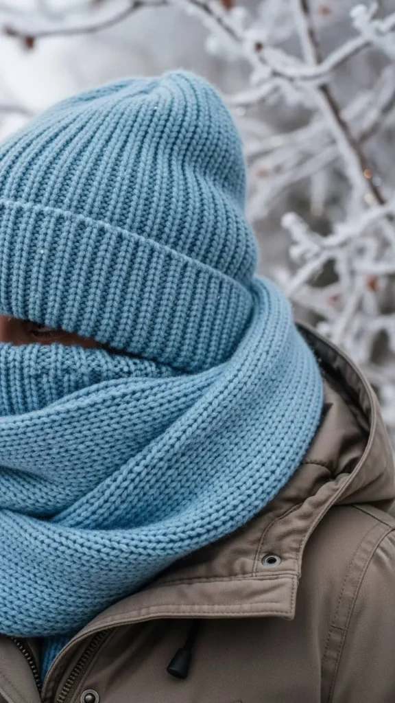 7. Powder Blue Beanie and Scarf Set with Neutral Parka