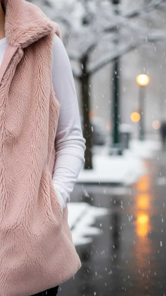 8. Blush Pink Faux Fur Vest Over Long Sleeve Tee