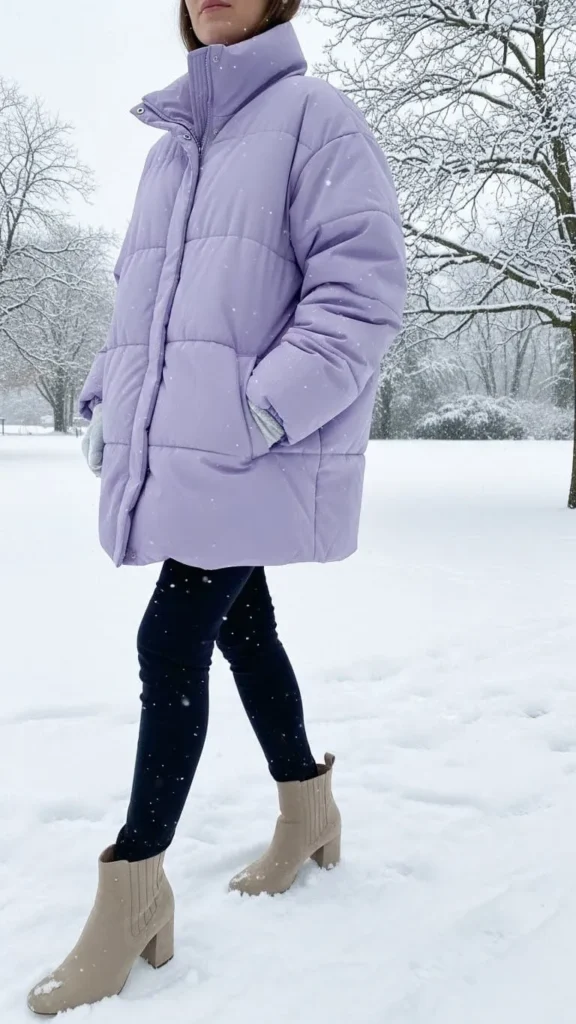 A lavender puffer jacket adds warmth and color punch. Pair it with neutral boots to balance the softness. Budget tip: spray waterproofing on suede or faux suede boots to protect them. This look works well for daily errands or winter walks.