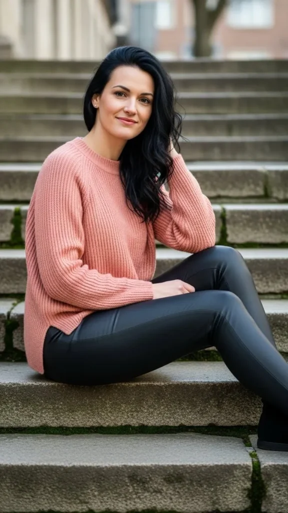Muted coral sweaters pair well with leather-look leggings for a chic winter vibe. Find synthetic leather leggings for affordable prices at discount outlets or secondhand shops. This contrast creates depth while keeping the palette soft and inviting.