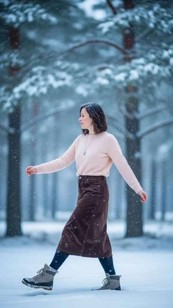 The soft pink turtleneck pairs beautifully with a grey wool skirt. It’s an easy way to mix soft and neutral tones. For a DIY version, add pastel patches or embroidery to an existing sweater or skirt. Wool skirts hold heat well and match nicely with tights.