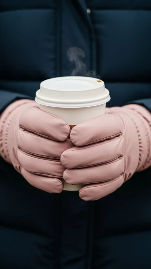 Small pastel accessories like powder pink gloves work beautifully with darker coats. Use gloves to introduce color without overwhelming your outfit. Padding adds warmth, and purchasing non-branded gloves can keep costs down.