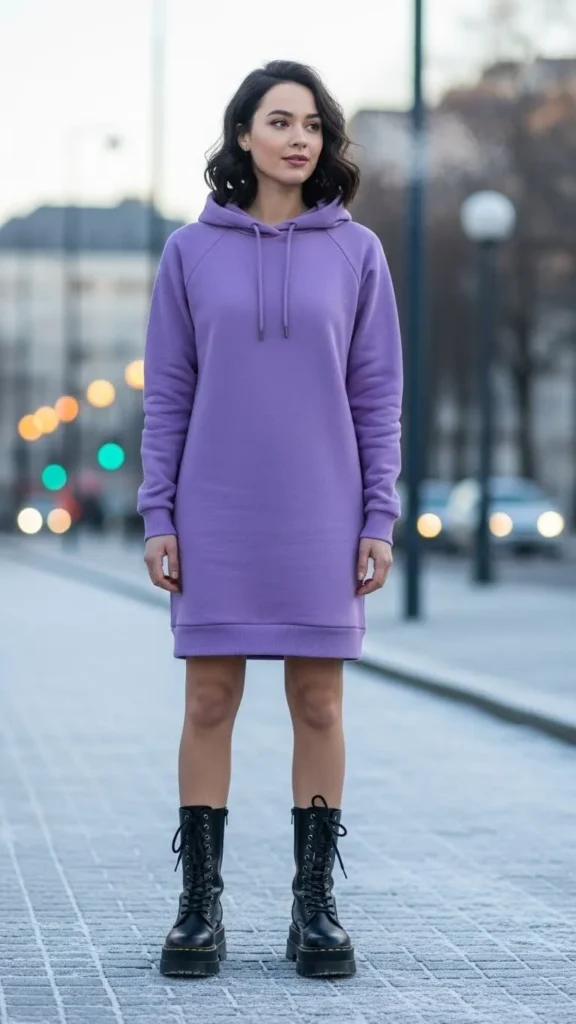 22. Soft Lilac Hoodie Dress with Chunky Boots