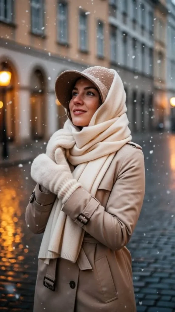 Cashmere scarves might seem pricey but can be found discounted or secondhand. They add luxury and warmth around your neck. Pair with cozy mittens and a classic trench coat for a polished snow day outfit. Trench coats repel moisture better than some fabrics and can handle lighter snowy days. Try adding a simple DIY touch—like trimming the scarf edges with faux fur or sewing mittens from old sweaters. This combo looks elegant and keeps you warm on a chill walk.