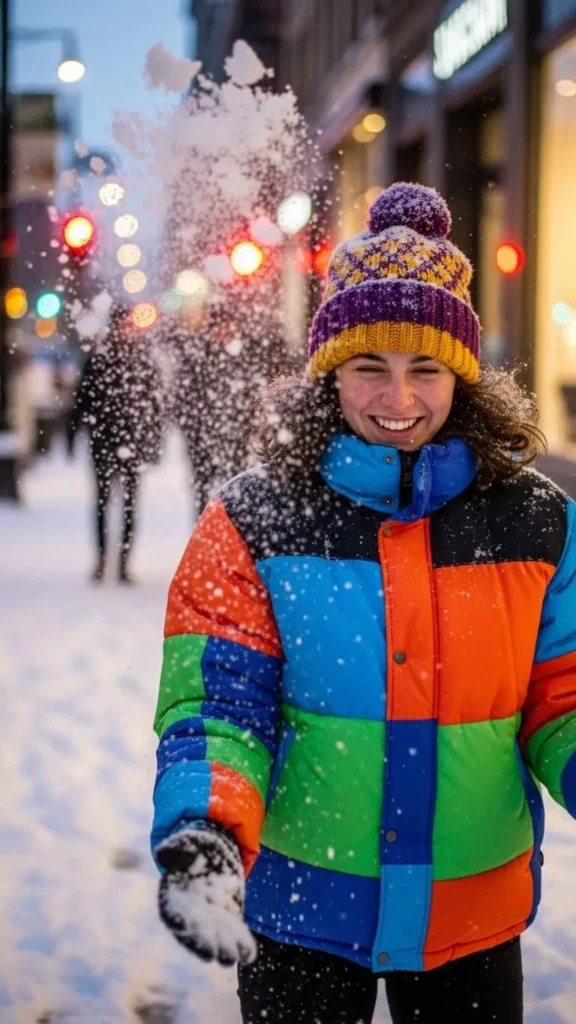 3. Colorful Puffer Jacket + Beanie + Waterproof Sneakers