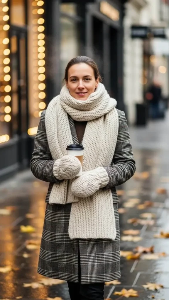 Plaid coats add pattern and personality to winter days. Combine with knitted scarves and mittens for warmth. These pieces can be secondhand or DIY made from old sweaters and yarn. Simple knitting projects can turn leftover yarn into mittens and scarves, saving costs. This look feels cozy and seasonal with minimal spending.