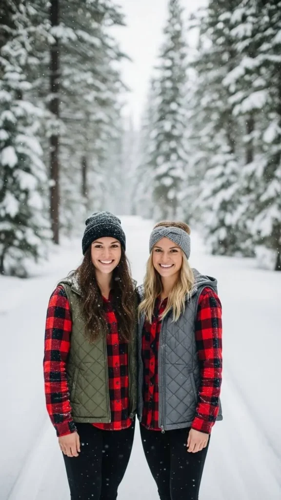 Layer a warm flannel shirt with a shearling vest for a rustic and warm look. Shearling adds warmth without the bulk of a coat—great for milder snow days. Slim jeans or jeggings tuck neatly into boots without feeling bulky. This look works on a budget by swapping shearling for fleece-lined vests or DIY-ing a vest using old fleece blankets. Button down the flannel and roll sleeves as needed for easy temperature control.