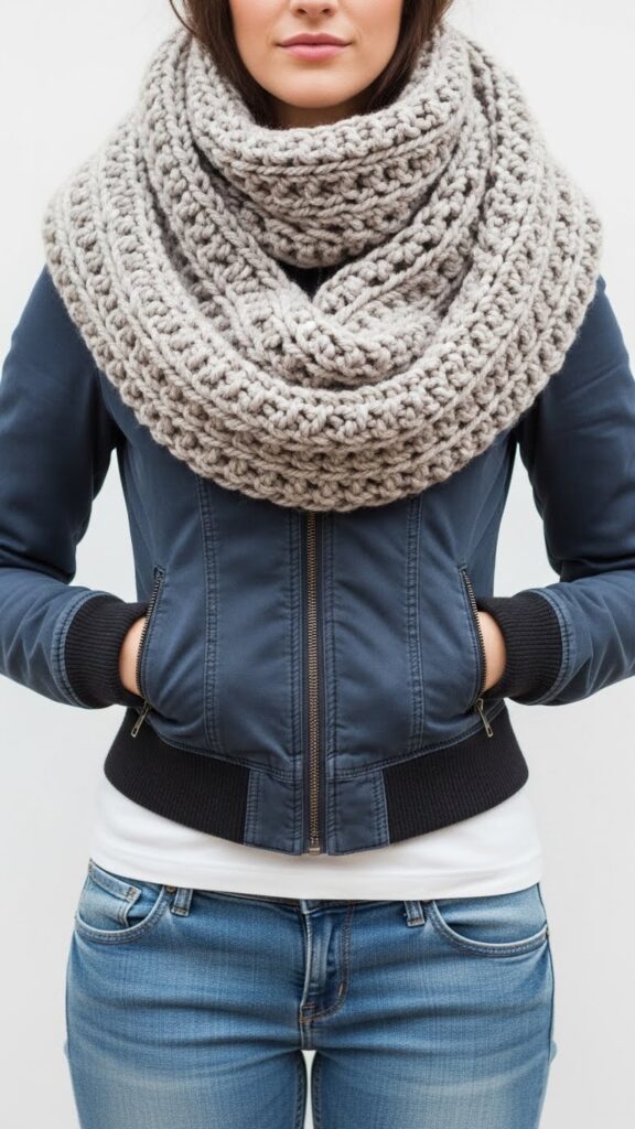 Focus on a chunky scarf as the centerpiece of the look. Pair with a fitted jacket to balance volume. Casual jeans keep it comfortable and practical. Scarves can be handmade or purchased cheaply. A fitted jacket can be a simple denim or bomber style warmed up by layering. This outfit is great for informal snow days and easy to put together.