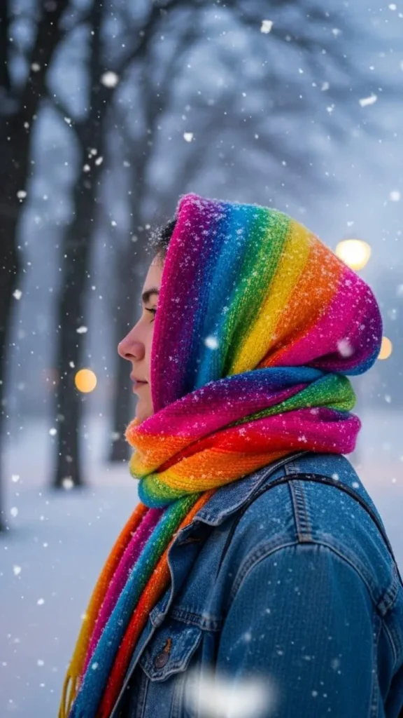 Add a bright scarf to elevate a simple denim jacket for winter days with light snow. Layer thermal base layers underneath the jacket for warmth without weight. Thermal layers are inexpensive and easy to find. Try scarves in bold colors to brighten cold days. The denim jacket adds casual cool and can be thrifted easily. Rolling scarf ends or tying them differently makes a fresh everyday look.