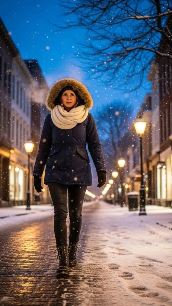 Quilted parkas are classic and trap heat well. Look for styles with faux fur trim on the hood for extra warmth around the face. High-waisted jeans help keep your lower back covered and warm, especially when you sit or bend. Tuck in knit sweaters for a polished silhouette. If your budget’s tight, check for end-of-season sales or swap faux fur trims on older coats with detachable ones from craft stores.