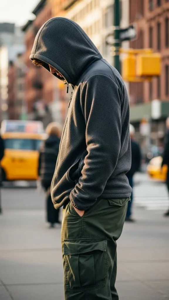 Fleece jackets are great for layering or casual snow day wear. Cargo pants offer pockets and room for layering underneath. Add a warm beanie to protect your head from the cold. These are often affordable finds at discount stores. For an easy DIY, sew inside cargo pockets with thermal lining from old blanket scraps. This outfit is functional and casual.