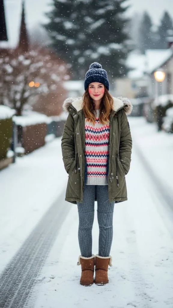 Chunky knit sweaters are winter essentials. They trap heat and add texture to your look. Pick one in a warm tone—cream, rust, or deep green—for instant cozy vibes. Pair it with thick leggings; fleece-lined ones are perfect for extra warmth. Ankle boots with a low heel garden practicality and style. This combo is comfortable and budget-friendly. If you want to DIY, add some fun patches or embroider small patterns on a plain sweater to personalize it. Don’t forget warm socks to keep toes toasty but invisible inside boots.