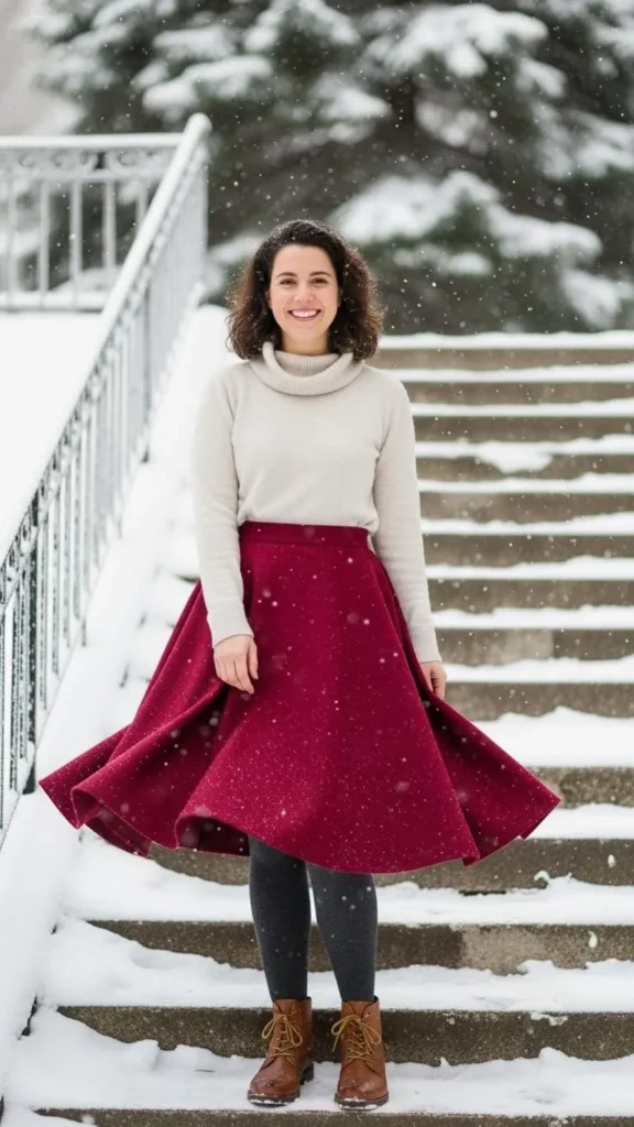 A flared wool skirt paired with thick tights feels feminine but warm. Add a turtleneck sweater on top to keep cozy. This look is easy to mix and match with pieces you have. Thick tights or leggings need not be expensive—look for sales or coupon deals. Adding felt pads to your shoes can help insulate feet further. Use sweater fabric scraps to patch worn tights for longer wear.