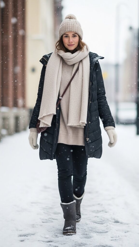 Puffer jackets trap warmth with their quilted fill. Opt for bright colors to brighten dull winter days. Complement the jacket with a snug beanie that covers your ears. Waterproof sneakers provide grip and keep feet dry while walking through snow patches. This outfit is perfect for casual days and requires minimal effort. Look for discounted puffers in outlets or upcycle an old jacket by adding custom fabric paint patterns. Waterproofing sprays on sneakers keep them snow-ready.