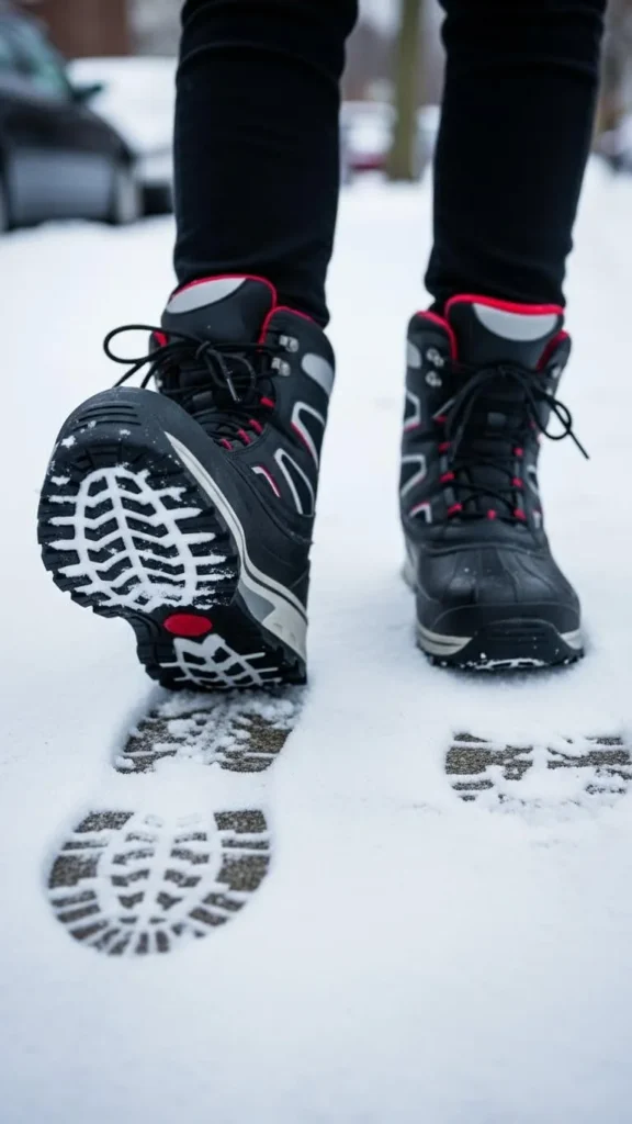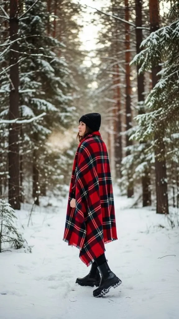 Plaid scarves add pattern and warmth. Chunky boots give grip and protection in snowy conditions. Throw on thick fleece-lined socks to guard against cold feet. These simple accessories make a huge difference and are affordable. Look for sales or secondhand options for scarves and boots. You can make fleece socks softer by washing them inside-out and air drying. This outfit works great for snowy hikes or casual days out.